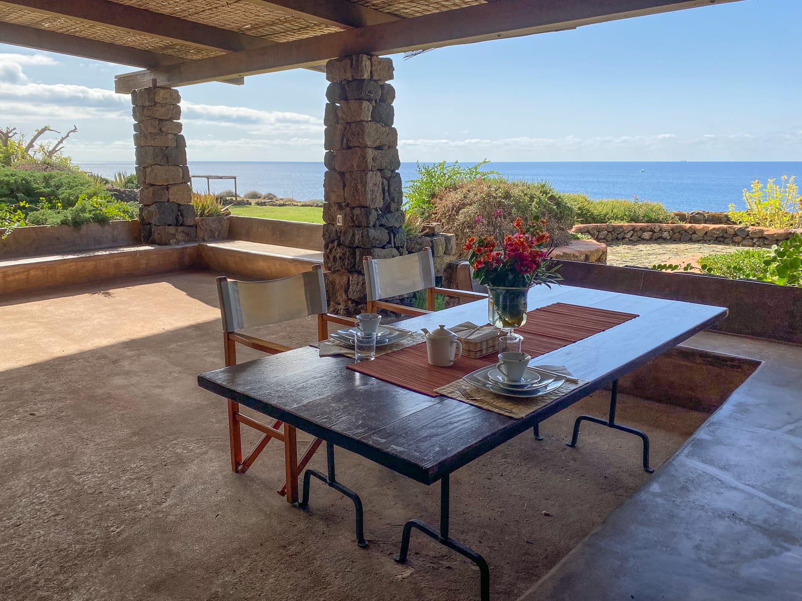 Questa terrazza è protetta da robusti cannizzi e, oltre ad un tavolo da pranzo comodo per sei, può accogliere gli ospiti su ducchene ricoperte da cuscini. Contiene anche un comodo divano dal quale a fine giornata ammirare il sole quando si tuffa nel mare.